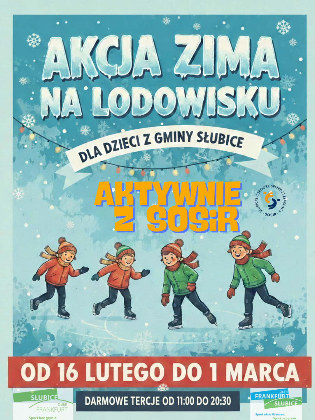 Słubicki Ośrodek Sportu i Rekreacji zaprasza dzieci z terenu gminy na darmową, 1,5-godzinną tercję na lodowisku.